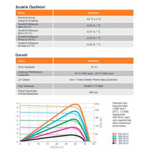 Doğrusal Performans Garantisi 10 yıl %90 üzeri, 25 Yıl %80 üzeri