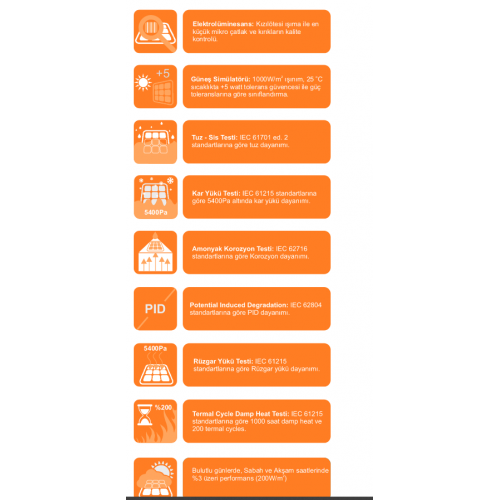 Amonyak Korozyon Testi: IEC 62716 standartlarına göre Korozyon dayanımı. Potential Induced Degradation: IEC 62804 standartlarına göre PID dayanımı.